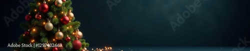 Ornamented Christmas tree against a dark background, Christmas tree with shiny ornaments, colorful garlands