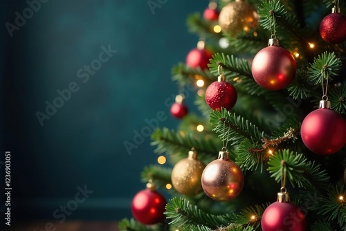 Ornamented Christmas tree with sparkling garland, ornaments,