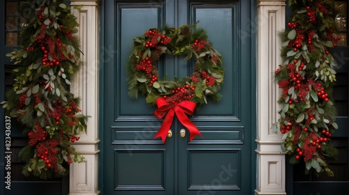 ornament, holly, sprig, illustration, chaplet, festive, ribbon, front, door, guest, cheerful, joyful, celebration, togetherness, spirit, greenery, red, berry, traditional, holiday, decoration, winter, evergreen, symbol, welcoming, creative, colourful, seasonal, nature, plant, christmas