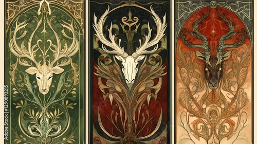 Ornate Art Nouveau Inspired Deer Antler and Wildlife with Floral Patterns and Organic Designs