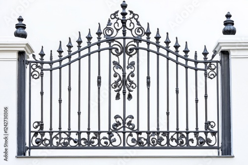beauty, pattern, architecture, entrance, ornate, elegant, fence, ornamental, decorative, wrought, security, white, view, structure, isolated, forging, beautiful, exterior, detail, classic, detail, gate, black, strong, safe, property, hard-wearing, style, iron, background, metalwork, artistic, ornament, design, solid, protection, metal