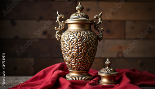 Ornate bronze urn resting on velvet cloth in traditional setting, remembrance