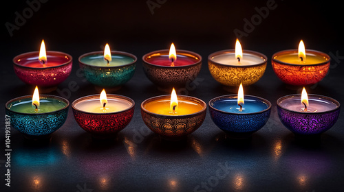 ornate candle holders, different colors, with burning candles.Happy Diwali