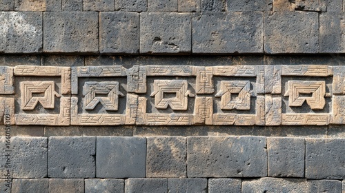 relief, carving, frieze, terracotta, stone, wall, pattern, design, ancient, ornament, decoration, architectural, detail, texture, motif, geometric, symbol, engraving, panel, structure, clay, dark, grey, brown, beige, aged, historical, cultural, repeated, symmetry, intricate, elevated, carved, art, background, history