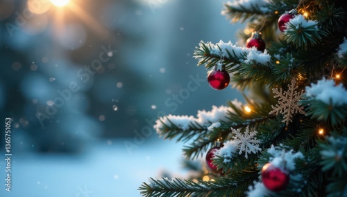 Ornate Christmas tree with sparkling snowflakes and frosty berries , festive, ornaments