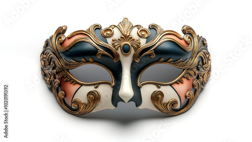 Ornate, decorative masquerade mask with intricate gold detailing and a mix of dark and light colors on white background