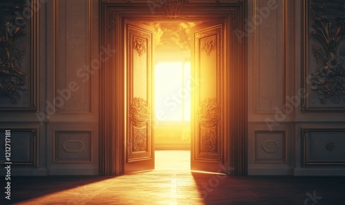 Ornate doors slightly open with warm light shining through, symbolizing opportunity, mystery, and new beginnings