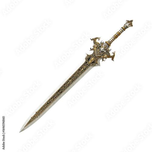 Ornate Fantasy Sword, Elegant Gold and Silver Weapon, Isolated on Black Background