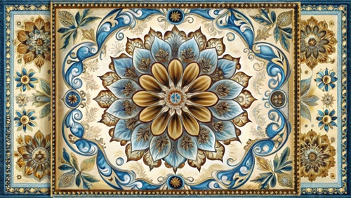 mandala, ceiling, floral, baroque, ornate, blue, gold, beige, design, pattern, flower, decor, art, interior, architecture, room, home, house, elegant, luxury, vintage, antique, classic, royals, palace, detail, intricate, complex, symmetry, circular, round, leaf, stem, bud, bloom, curved, spiral, whimsical, rustic, geometric, abstract, texture, background, image, photo, graphic, style, aesthetic