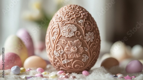 easter, egg, chocolate, floral, design, ornate, treat, spring, holiday, candy, sweet, dessert, pastel, brown, pink, white, flower, decoration, beautiful, delicate, intricate, embossed, relief, confectionery, delicious, festive, celebration, season, occasion, gift, artisan, handcraft, unique, elegant, romantic, colours, texture, surface, background