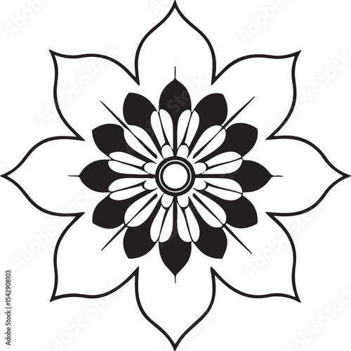 flower, floral, design, pattern, geometric, ornate, black-and-white, vector, illustration, decorative, art, symbol, motif, line art, graphic, drawing, shape, abstract, symmetry, radial, circular, center, central, complex, element, background, outline, monochrome