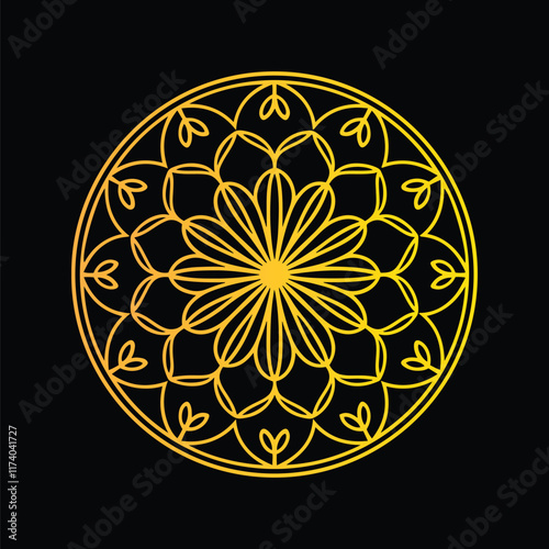 Ornate Gold Mandala Design on Black Background. This elegant, symmetrical mandala design features intricate, gold-outlined floral patterns arranged in a circular motif.
