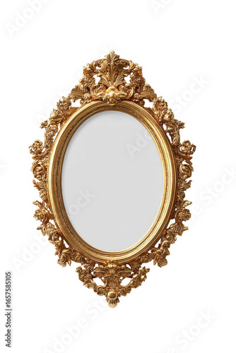 mirror, gold, oval, frame, ornate, decorative, antique, vintage, classic, elegant, luxury, gilded, carved, relief, floral, foliage, scrollwork, pattern, symmetry, detail, design, art, empty, white, background, isolated, wall, hanging, display, object, interior, beauty, exquisite, refined, crafted, beautiful, precious