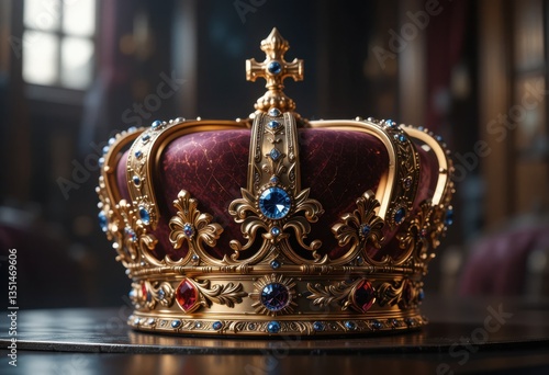 Ornate Golden Crown with Jewels Resting on a Dark Wooden Table