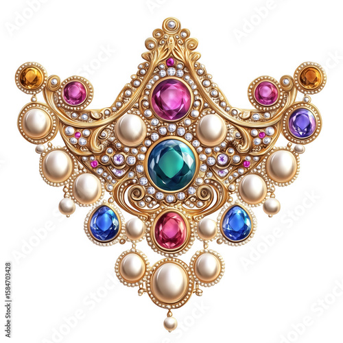 Ornate golden jewelry design adorned with pearls diamonds and colorful gemstones on transparent