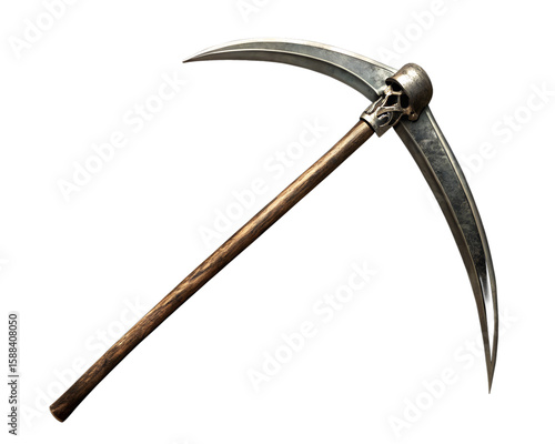 scythe, grim, reaper, death, symbol, weapon, skull, metal, blade, handle, wood, ornate, decoration, fantasy, dark, gothic, halloween, ancient, mediaeval, skittish, creepy, scarey, mythology, supernatural, tool, agriculture, harvest, icon, isolated, transparent, background, object, prop, costume