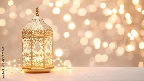 lantern, light, glowing, gold, ornate, decorative, intricate, pattern, metal, design, illumination, festive, celebration, warm, candlelight, background, bokeh, blur, soft, detail, surface, tabletop, display, object, decor, home, interior, lighting, art, tradition, symbol, eastern, arabian, islamic, culture, religion