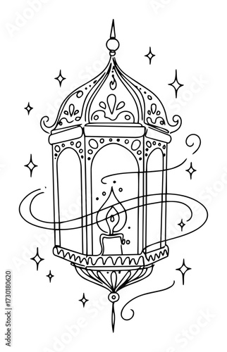 lantern, lamp, light, magic, fantasy, vintage, candle, flames, ornate, decorative, arabic, ramadan, fairy tale, sparkle, glow, drawing, illustration, vector, line art, vignetting, outline, black-and-white, icon, symbol, celebration, decor