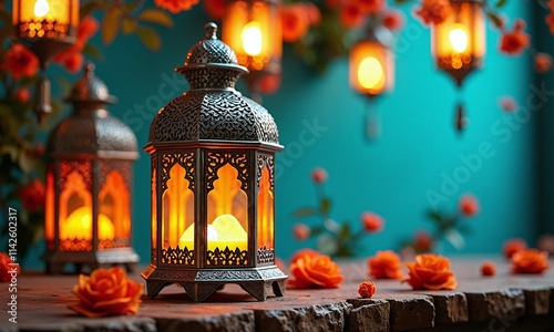 Ornate Moroccan lanterns glowing warm light intricate metalwork