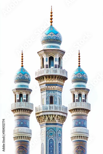 Ornate mosque minarets, detailed turquoise, intricate design.
