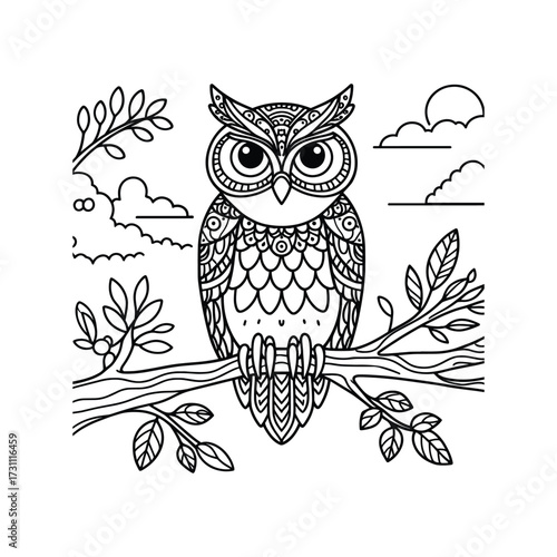 owl, tree branch, nature, illustration, foliage, bird, art, wildlife, design, tree, animal, feather, sky, leaf, pattern, scenery, serene, detailed, colouring, peaceful, branch, environment, artistic