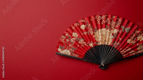 fan, red, gold, peony, butterfly, floral, oriental, asian, elegance, pattern, design, art, traditional, festive, cultural, ornate, vintage, texture, detailed, premium, imagery, background, decor, accessory, elegant, ornamental, decorative, luxurious, ceremonial