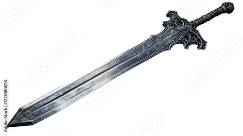 Ornate Steel Sword: An intricately detailed, silver sword with a dragon-shaped hilt, crafted for strength and elegance, lies isolated against a contrasting backdrop.