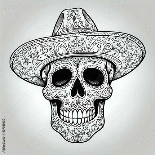 Ornate Sugar Skull with Sombrero Hat Line Art Illustration