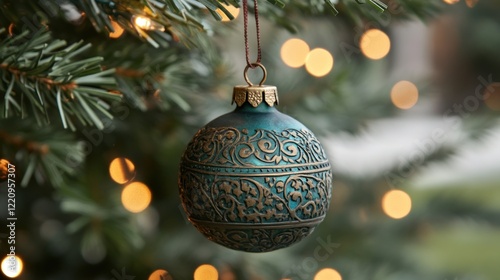 ornament, christmas, teal, tree, hanging, decoration, festive, holiday, winter, season, celebration, decor, beautiful, elegant, design, intricate, pattern, gold, bronze, detail, handcraft, unique, special, traditional, classic, vintage, antique, style, christmas, ball, sphere, glossy, shimmer, light, bokeh, blur, background, green, brown, cord, string