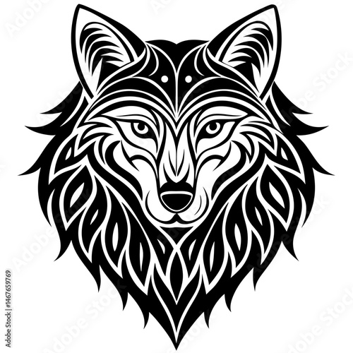 Ornate Tribal Style Wolf Head Design Black and White Illustration