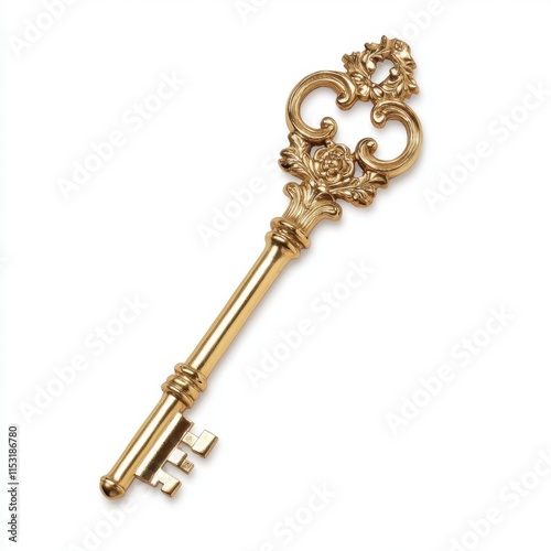 Ornate vintage golden key resting on a flat surface with intricate designs and floral accents