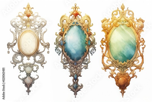Ornate vintage mirrors in pastel hues with intricate frames, reflecting elegance and luxury of classic design, perfect for home decor inspirations.