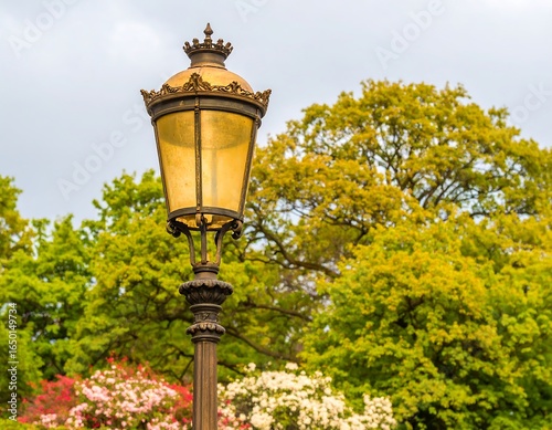 Ornate vintage street lamp amidst lush foliage in a tranquil park setting