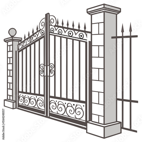 gate, wrought iron, ornate, decorative, metal, fence, entrance, driveway, pillar, stone, brick, spike, scrollwork, architectural, classic, elegant, secure, property, boundary, exterior, design, illustration