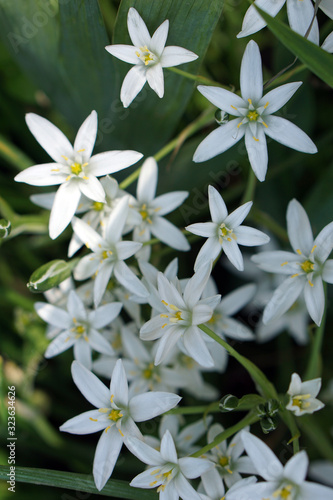 Ornithógalum blooming flowers brunch in garden with copy space in minimal style, template for lettering,