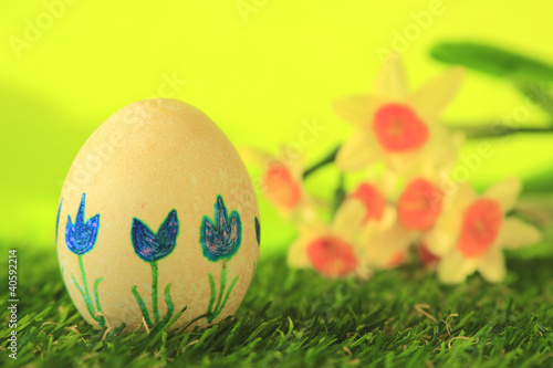 egg, easter egg, colourful, painted, ornate, dyed, easter, 1, an, green, fresh, grass, grass, artificial, decoration, decorative, spring, decoration, easter egg, egg, paint, colourful, yellow, blue, pattern, tradition, easter, christian, ecclesiastical, tight, crosswise, horizontal format, sharp, blurred, depth of field, depth of focus, german
