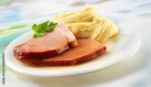 Osterschinken, Braten, Kartoffelpürree, Sauce, Bratensauce, Tellergericht,