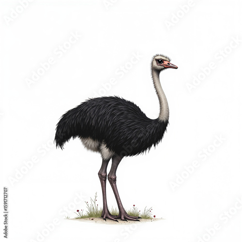 ostrich, bird, standing, black, white, grass, nature, wildlife, animal, tall, feather, leg, wild, habitat, brown, natural, elegant, profile, environment, flightless, exotic, walking, beautiful, large, majestic, foot, wildfowl, safari, animal kingdom, nature reserve, feathered, park, fauna, species, landscape, south africa, ecological, biodiversity, animal portrait, emu, zoo