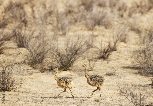 Ostrich (Struthio camelus) . Two chicks. Kalahari Desert, Kgalagadi Transfrontier Park, South Africa