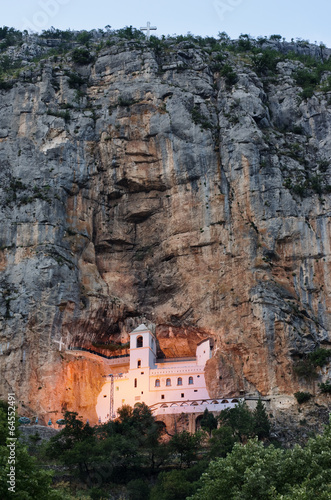 church, monastery, bell tower, cross, building, architecture, cave, rock, rocky, rockface, mountain, cliff, nature, natural, twilight, night, night view, by night, illuminated, light, culture, traditional, history, historical, historical building, old, ancient, pilgrimage, religion, serbian, orthodox, christian, christianity, landmark, famous, sightseeing, symbol, travel, vacation, tour tourism, capital, montenegro, montenegrin, europa, eastern
