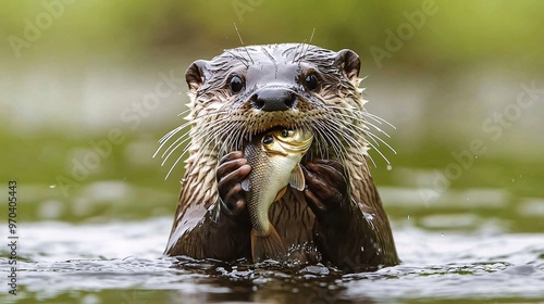 Otter Holding Fish in River
