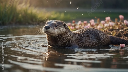 Otter Swimming in Pond with Ripples and Pink Flowers