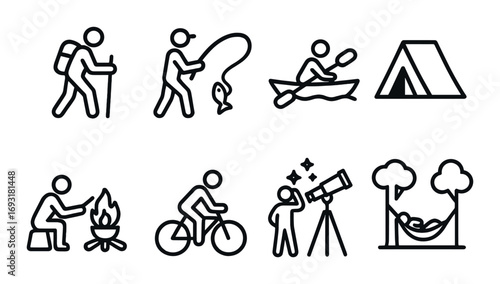 activity, silhouette, icon, hiking, fishing, kayak, camping, cycling, hammock, adventure, travel, nature, exploration, recreation, sport, leisure, wilderness, backpacking, trekking, river, forest, mountain, relaxation, journey, starry, night, telescope, paddling, campfire, sky, rest, retreat, holiday, expedition, leisure time, discovery