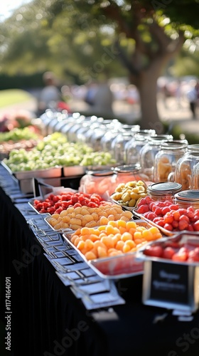 food, buffet, fruit, vegetable, table, outdoors, summer, party, event, catering, fresh, healthy, delicious, colourful, vibrant, picnic, garden, sunshine, bright, display, arrangement, presentation, serving, banquet, feast, meal, snack, dessert, strawberry, raspberry, cantaloupe, salad, citrous, tomatoes, jar, container, eatery, market, farm, produce, organic, natural, ripe, juicy, side dish