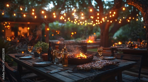 dinner, party, night, light, garden, food, bar-b-q, table, people, ambience, evening, celebration, summer, friends, family, drink, delicious, rustic, wooden, fire, warm, cosy, enjoying, togetherness, happy, gathering, outdoors, gourmet food, party food, bar-b-q, grilled, meat, summer night, quality time, balefire, wood, wine, fun