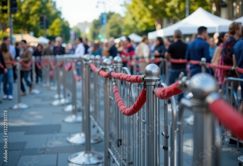Outdoor Event Queue with Red Barriers and Busy Crowd in Background