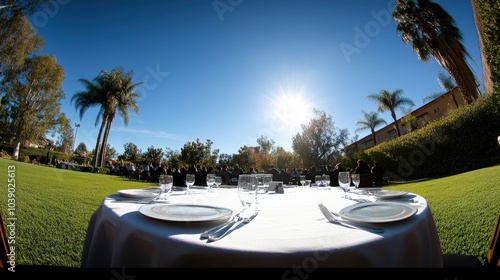 Outdoor Event with Elegant Table Setting under Sunlight