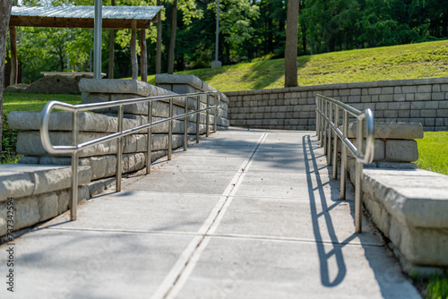 ramp, architecture, sidewalk, exterior, railing, stainless, steel, ada, accessible, sloped, access, structure, daytime, sunny, summer, outdoors, nobody, no people, empty, example, concrete, fall, autumn, sharpened, journey, grey, background, line, abstract, street, geometric, texture, city, alone, goal, blue, nature, park, grass, descent, wheelchair, ascent, construction, pavement, stone, urban, disability