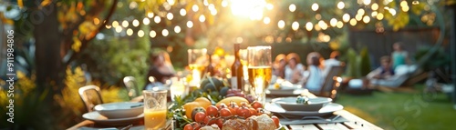 Outdoor Garden Party with Festive Lights and Dinner Table Set for a Summer Evening Gathering