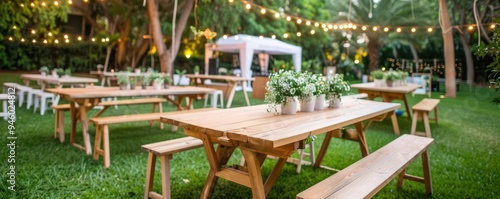 Outdoor garden setting with wooden tables and string lights, ready for an event or celebration under a peaceful, green environment.